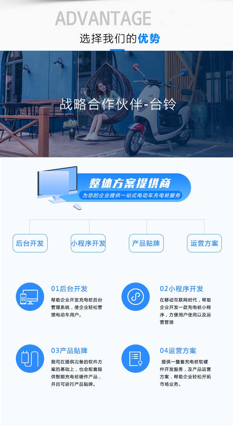 動(dòng)車(chē)、智能充電樁、智能充電柜、電動(dòng)車(chē)銷(xiāo)售與售后平臺(tái),致力于打造一套完整的電動(dòng)車(chē)生態(tài)圈,為客戶(hù)提供電動(dòng)車(chē)從購(gòu)買(mǎi)到使用、充換電及售后乖全方位的產(chǎn)品體驗(yàn)。